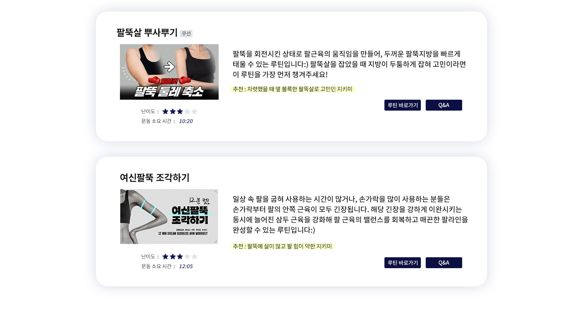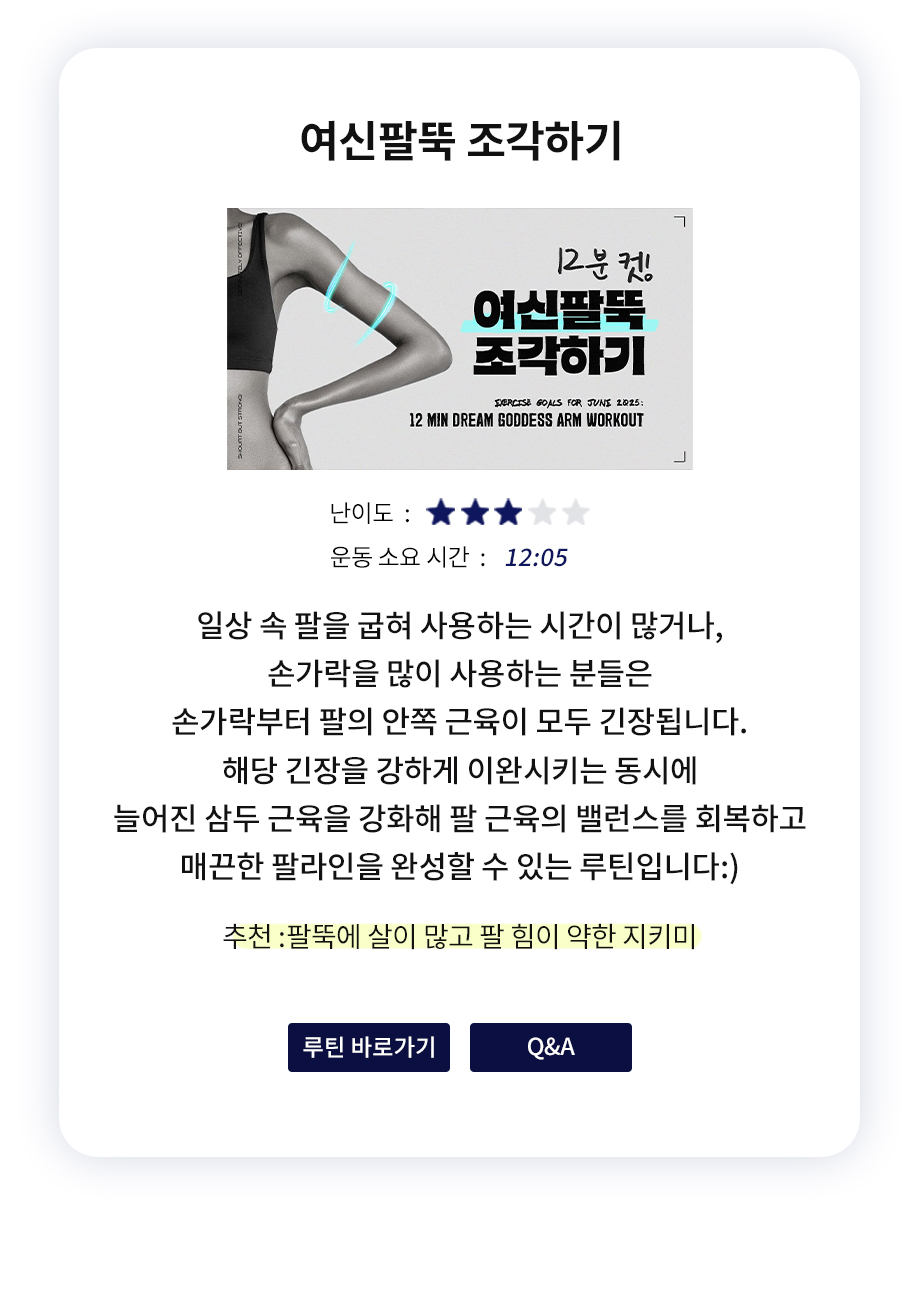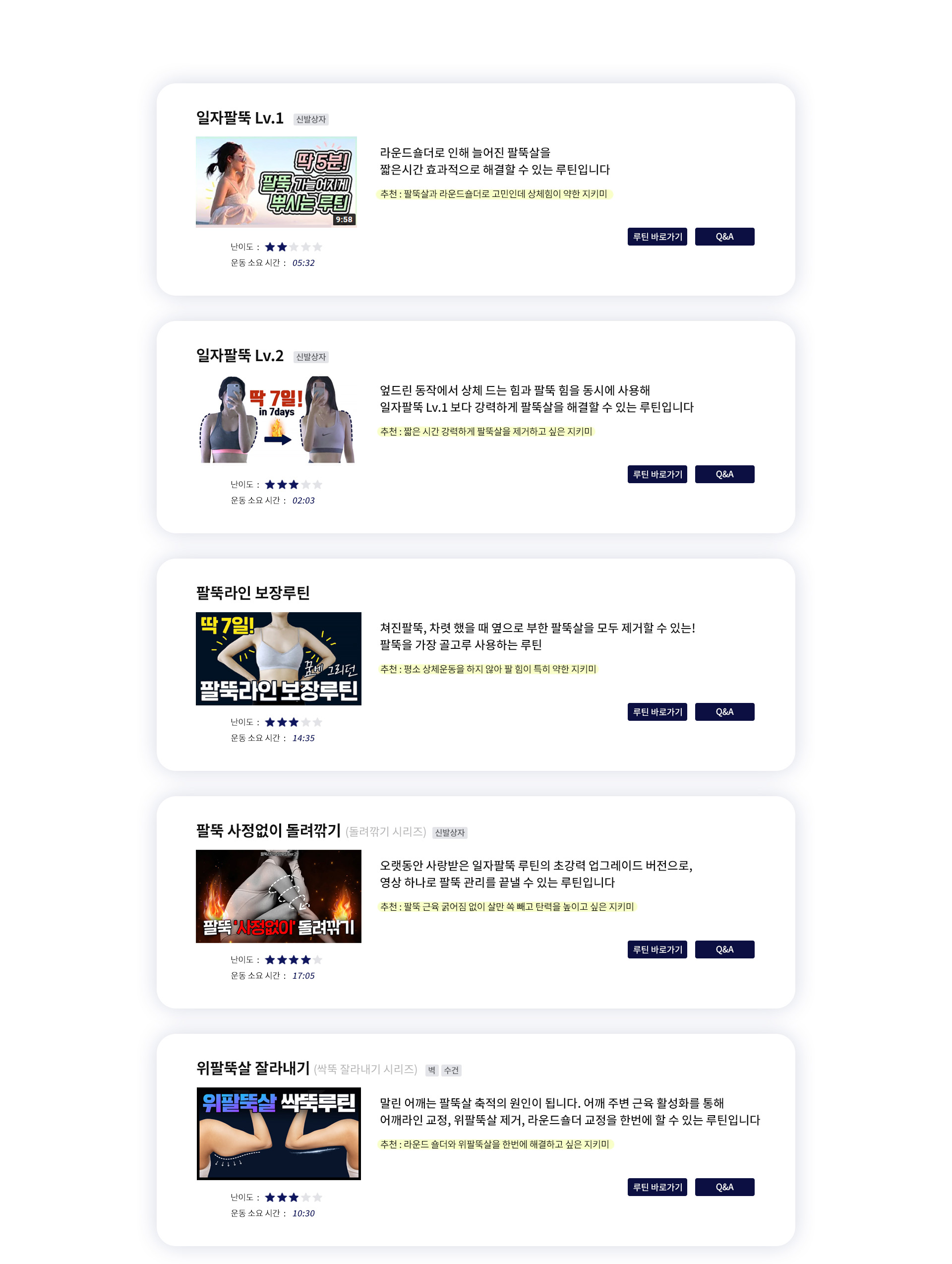 추천 / 난이도 / 운동시간을 참고해 내 몸에 알맞은 운동을 직접 선택해 보세요 :)