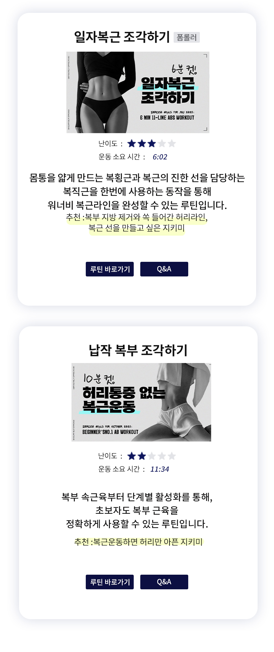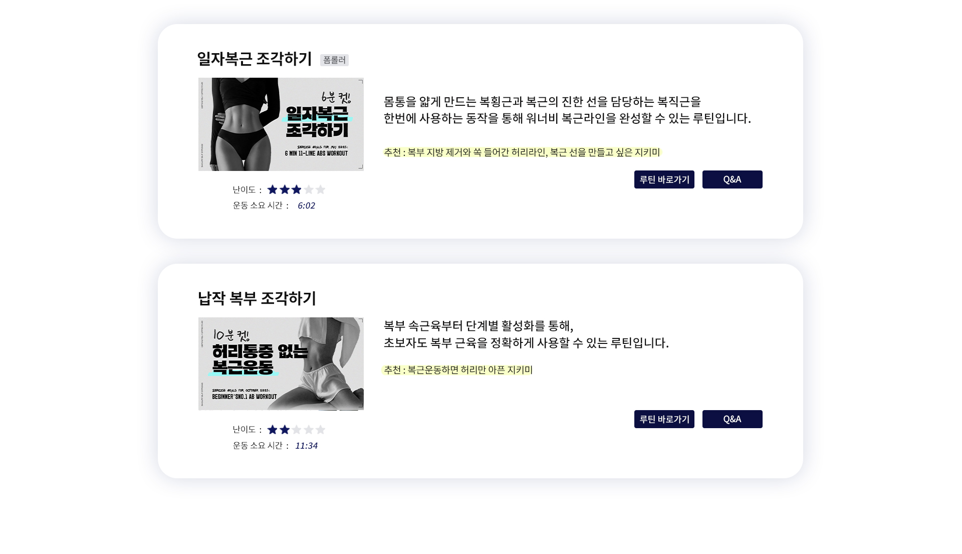 추천 / 난이도 / 운동시간을 참고해 내 몸에 알맞은 운동을 직접 선택해 보세요 :)