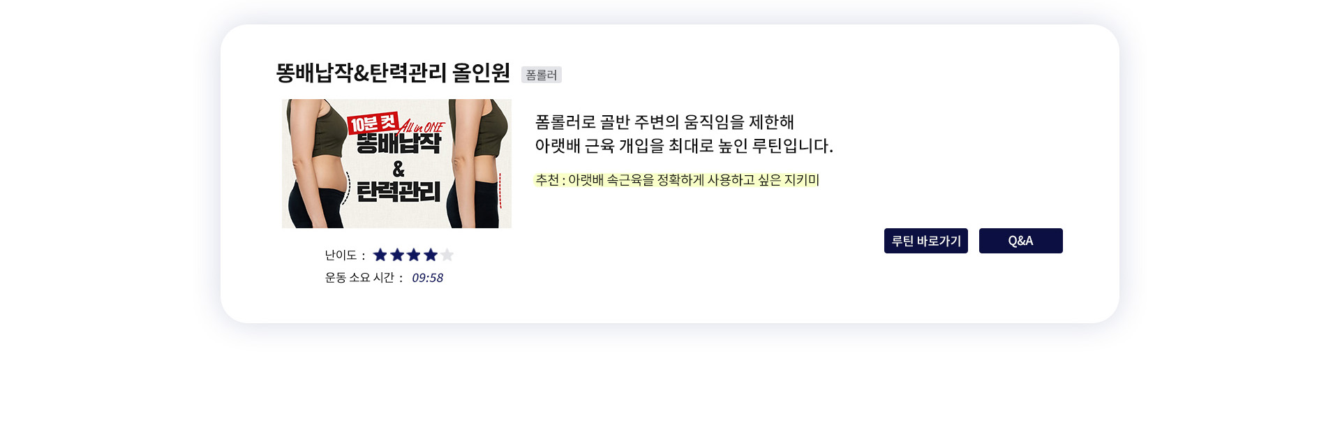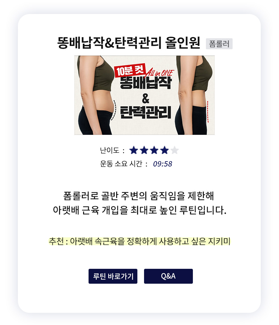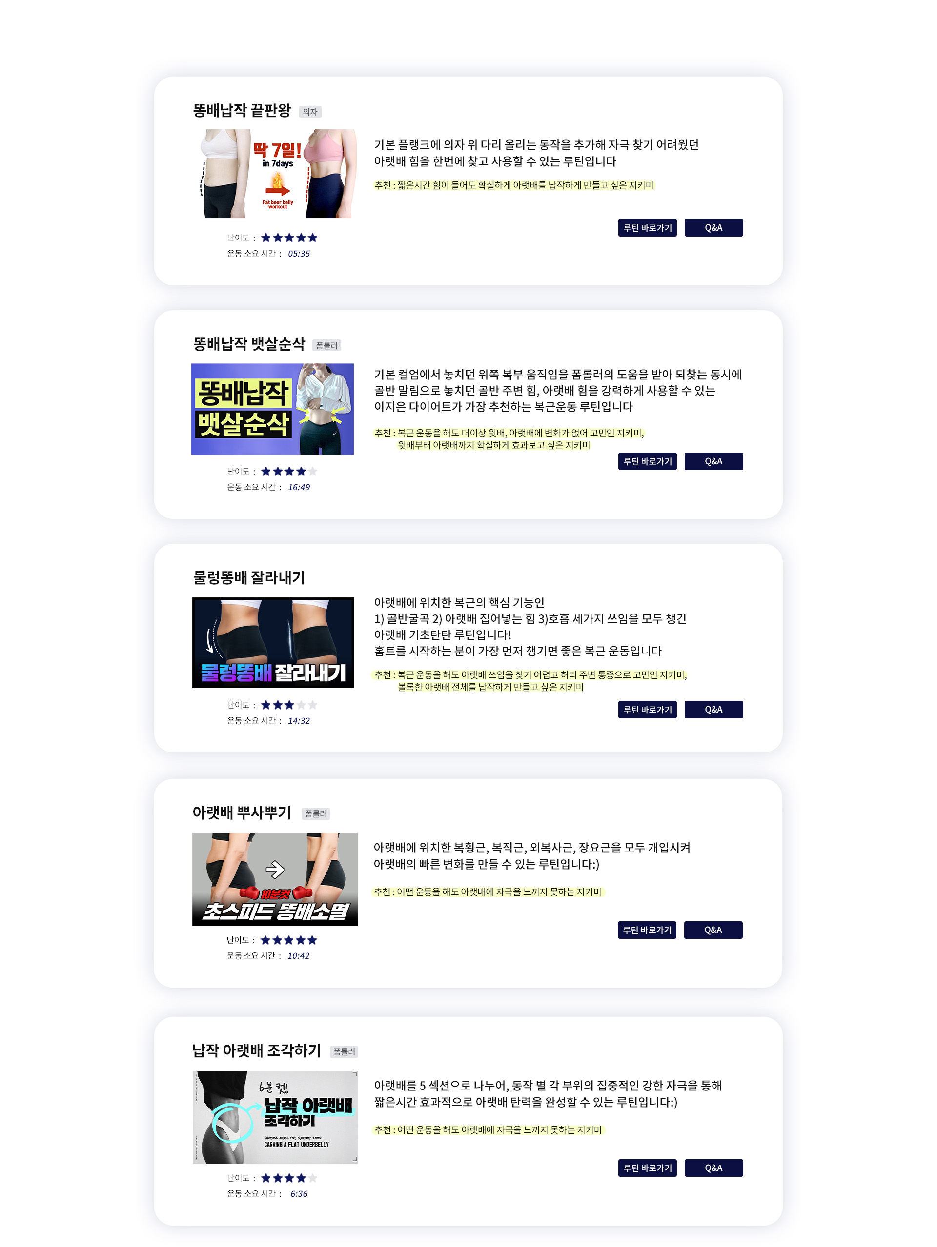 추천 / 난이도 / 운동시간을 참고해 내 몸에 알맞은 운동을 직접 선택해 보세요 :)