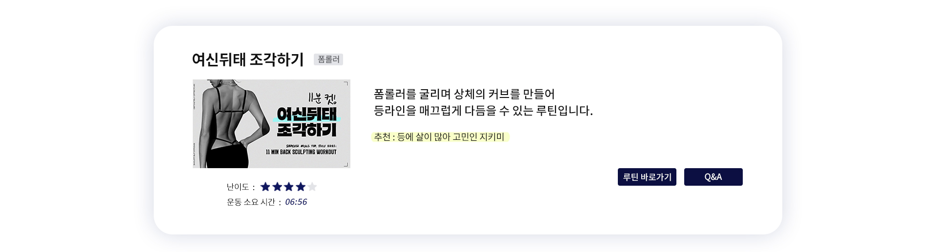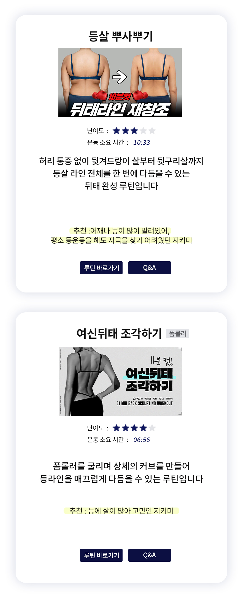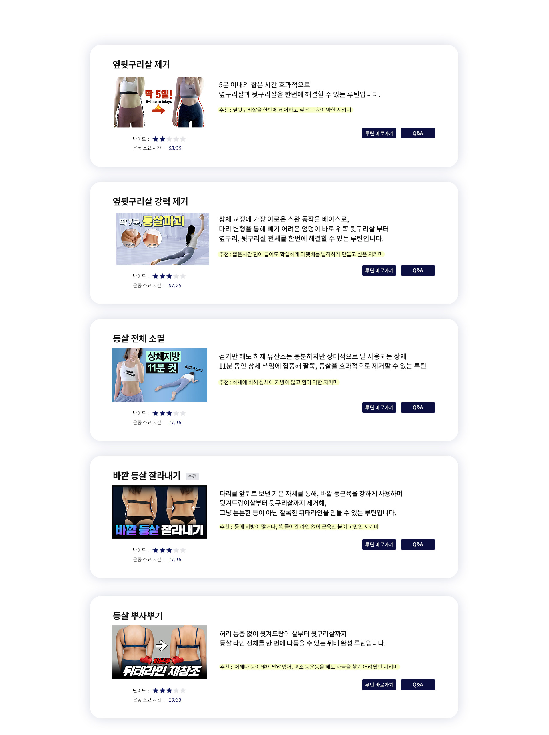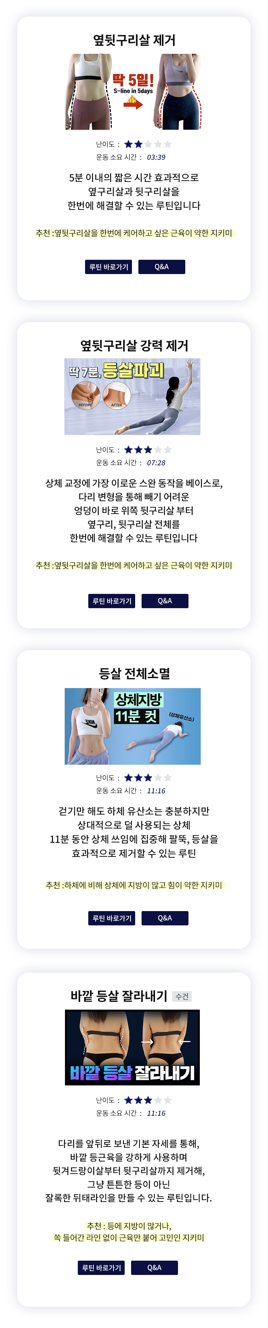 추천 / 난이도 / 운동시간을 참고해 내 몸에 알맞은 운동을 직접 선택해 보세요 :)