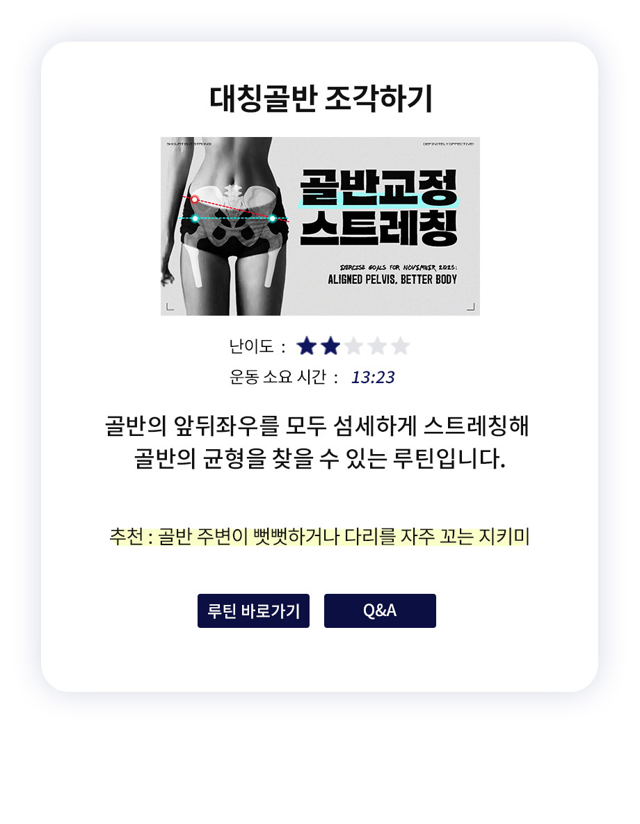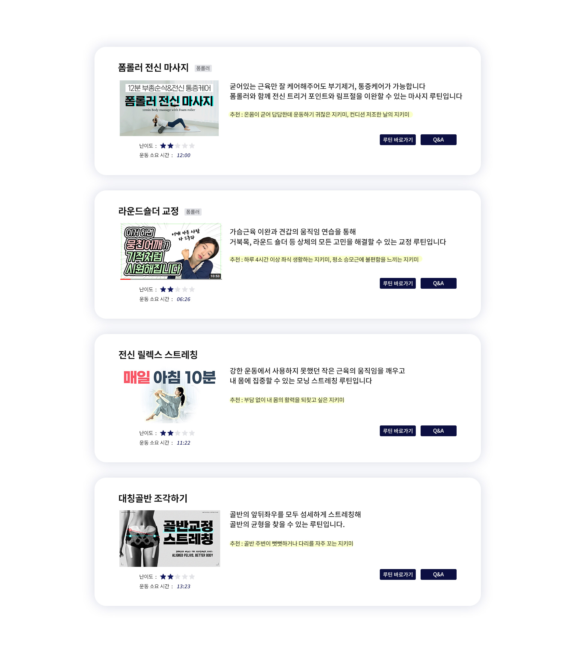 추천 / 난이도 / 운동시간을 참고해내 몸에 알맞은 운동을 직접 선택해 보세요 :)