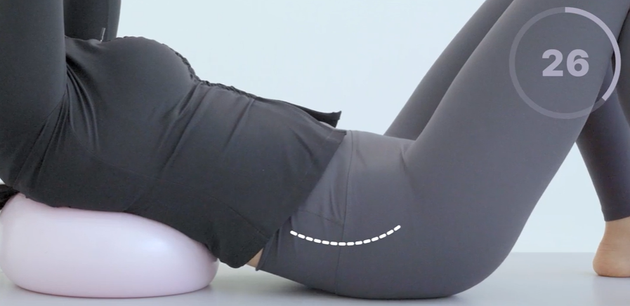 등 아래에 미니 짐볼 두고 하늘 보고 누워 복부가 내밀어지는 방향이 되도록 누운 상태로 1분간 호흡하며 기다리면, 해당 부위를 보다 빠르게 이완시킬 수 있습니다.